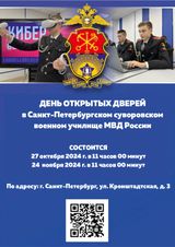 24 ноября 2024 года в 11.00 состоится «День открытых дверей». Актуальная информация представлена на официальном сайте училища https://спбсву.мвд.рф/.