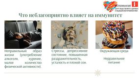 Что неблагоприятно влияет на иммунитет:,1. Неправильный образ жизни (употребление алкоголя, курение, малое количество физической активности);,2. Стрессы, депрессивное состояние, повышенная раздражительность, усталость и плохой сон;,3. Окружающая среда;,4. Неправильное питание.,