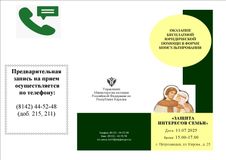 Уважаемые родители! 11.07.2025 с 15.00 до 17.00 года по адресу г. Петрозаводск, ул. Кирова , 25 состоится консультирование по вопросам интересов семьи. Обращаем Ваше внимание на предварительную запись на прием.