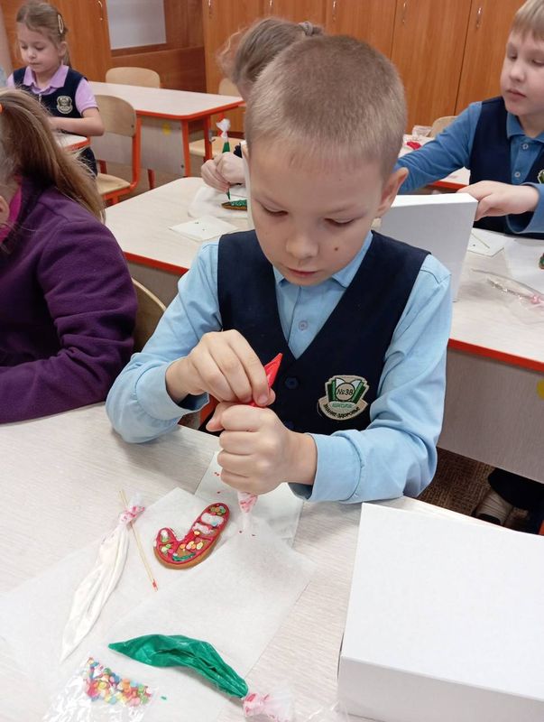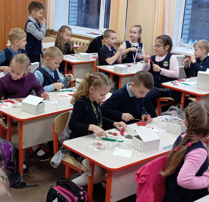 19 декабря ученики 1 "б" класса побывали на увлекательном предновогоднем мероприятии в стенах школы - мастер-классе по росписи имбирных пряников. Организатор Елена Сергеевна рассказала ребятам историю возникновения имбирных пряников, процесс их изготовления занимал целых четыре дня. Для прочности пряников в тесто добавляют карамель. В отдельный день готовили глазурь для украшения пряников. Глазурь ещё и делает пряники мягкими и нежными. В процессе украшения пряников каждый ребëнок почувствовал себя в роли кондитера. Работа удалась! Результат замечательный! Дети счастливы! Спасибо родителям за такой праздничный подарок деткам!