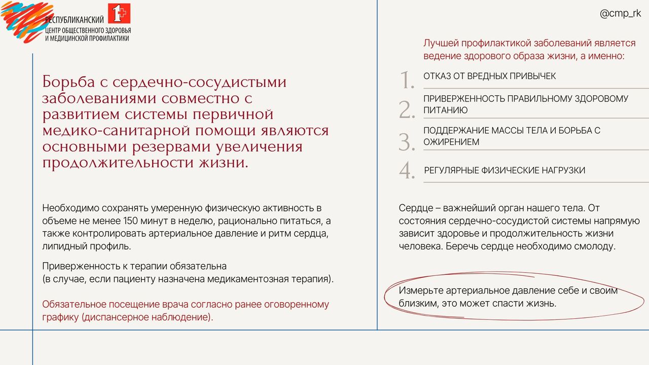 - Лучшее лечение – профилактика! Чтобы поддерживать и сохранять здоровье сердечно-сосудистой системы необходимо вести здоровый образ жизни, отказаться от вредных привычек, сохранять умеренную физическую активность в объеме не менее 150 мин в неделю, поддерживать оптимальную массу тела, придерживаться рационального питания, а также контролировать артериальное давление, сердечный ритм, уровень холестерина и глюкозы крови;