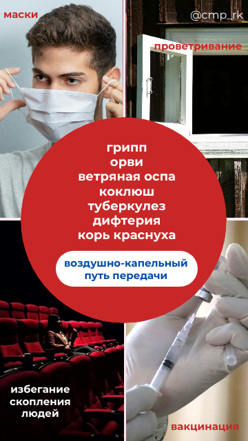 1. Воздушно-капельный путь передачи (грипп, простудные заболевания, ветряная оспа, коклюш, туберкулез, дифтерия, корь, краснуха и др.) – для профилактики используются маски, проветривание, недопущение скопления большого количества людей в помещении;