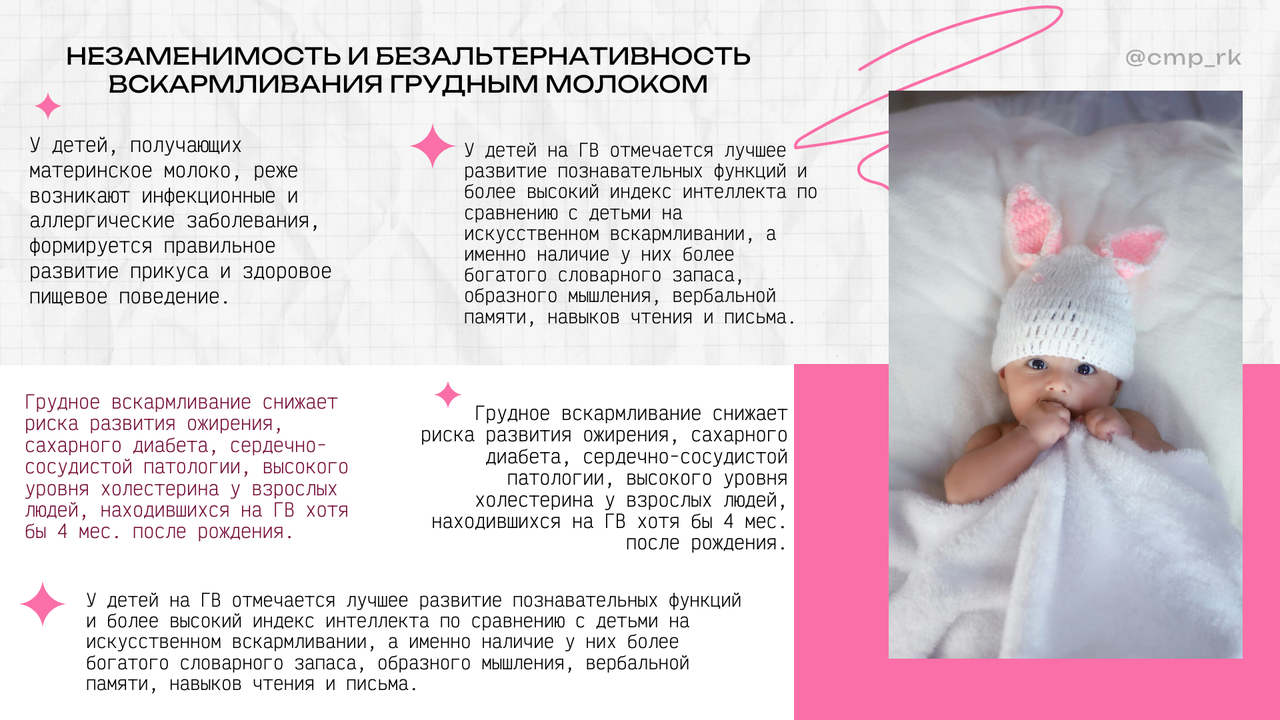 - Важна поддержка и пропаганда грудного вскармливания. Грудное вскармливание является важным средством первичной профилактики заболеваний ребенка (в том числе профилактики избыточного веса и ожирения во взрослых возрастах) и матери и незаменимым средством обеспечения идеального питания для здорового развития младенцев.